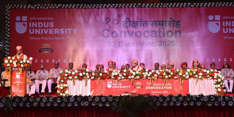 Ahmedabad: Indus University organized its 10th Convocation Ceremony at its Rancharda campus. According to the university, this year degrees were conferred upon 1,248 undergraduate students, 327 postgraduate students, and 8 PhD students. Additionally, 18 students from various courses received gold medals and 6 students were presented with memorial awards.
